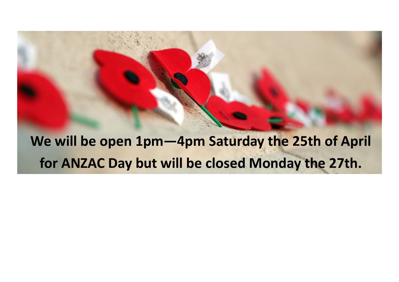 We will be open 1pm—4pm Saturday the 25th of April for ANZAC Day but will be closed Monday 27th.