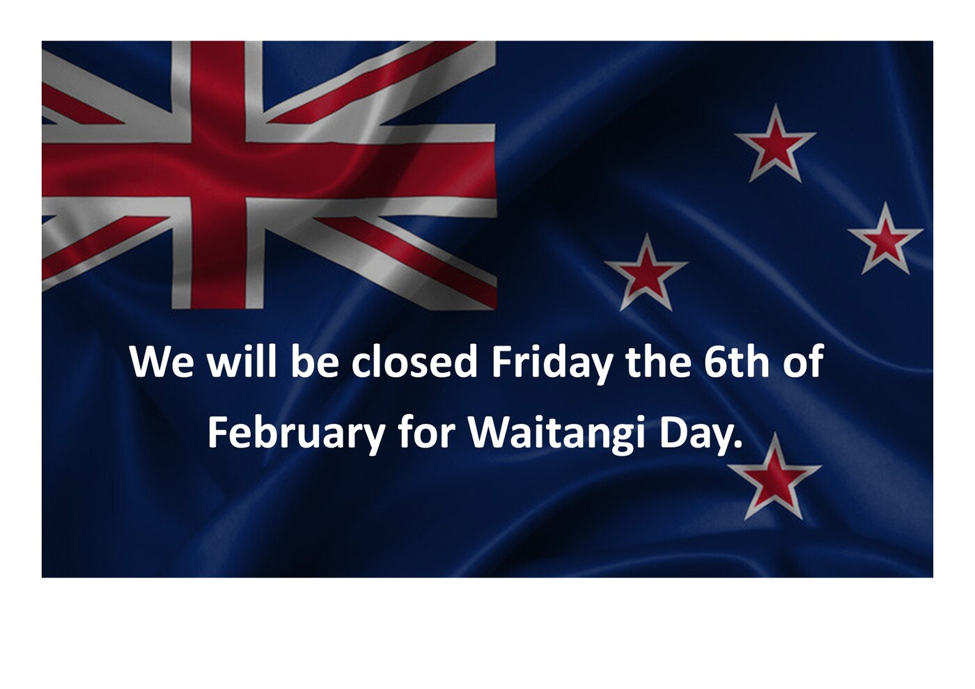 We will be closed Friday 6th of Feburary for Waitangi Day.