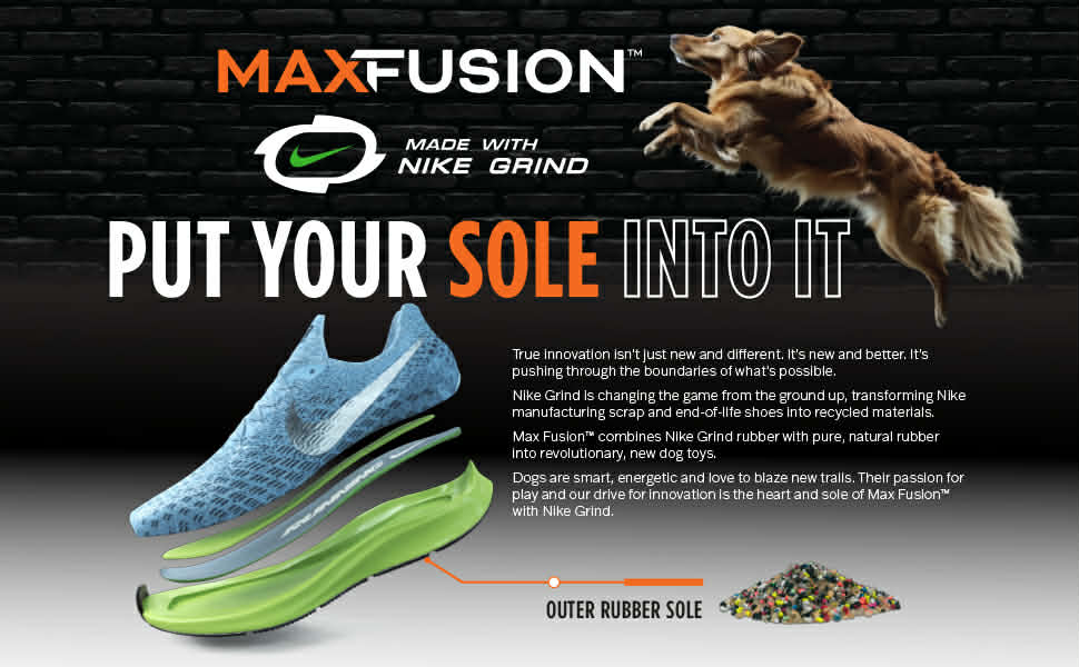Max Fusion is changing the game from the ground up by combining Nike Grind rubber from unused footwear soles with pure, natural rubber. The results are new, durable, engaging toys that matches your dog's passion for play.